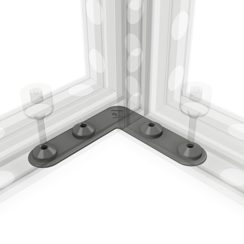 Nasze sworznie ECO gwarantują solidność konstrukcji. Ich ślad węglowy jest 8-krotnie mniejszy. Ponadto zachowują lekkość i nadają się do układania w stos. To jest płyta 90° z 4 wypustkami o średnicy 30 mm z gwintem M8. Nadaje się do większości połączeń 90